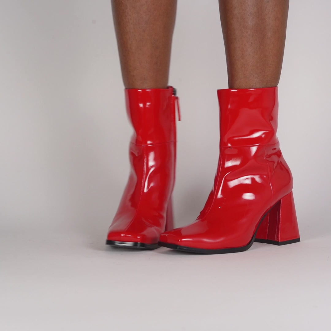 Patent boots? Bring on the rain. The Saffle is a heeled boot crafted from cherry red patent faux-leather, with a... See More